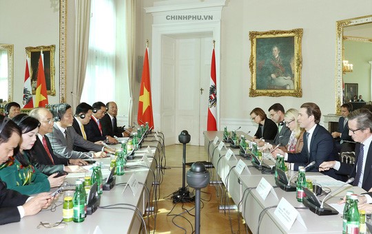 Thủ tướng Nguyễn Xuân Phúc cảm ơn và đánh giá cao các nguồn vốn vay ưu đãi của Áo dành cho các dự án trong lĩnh vực đường sắt, chăm sóc sức khỏe, đào tạo nghề cũng như hoạt động hiệu quả của 30 doanh nghiệp Áo đầu tư tại Việt Nam.