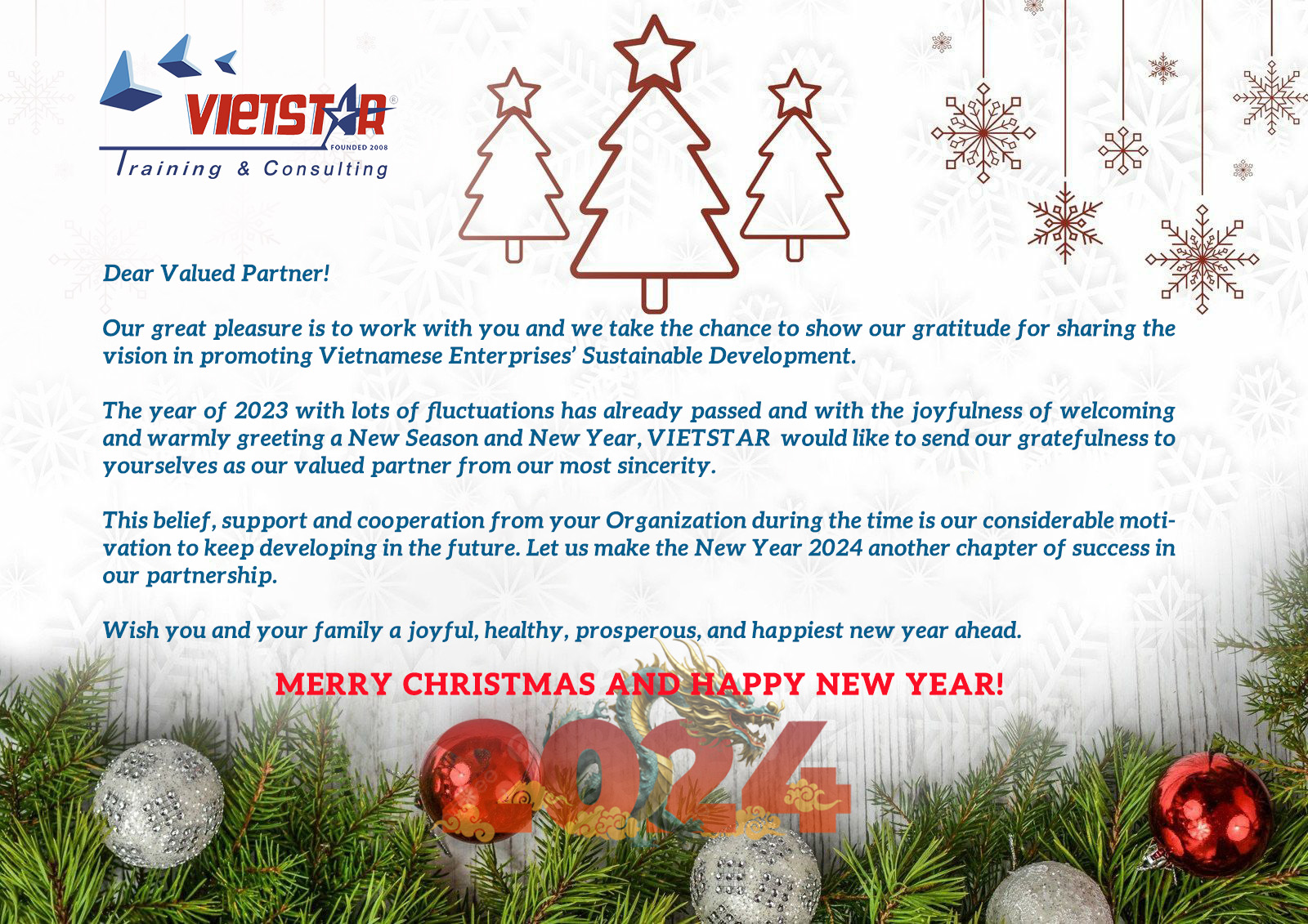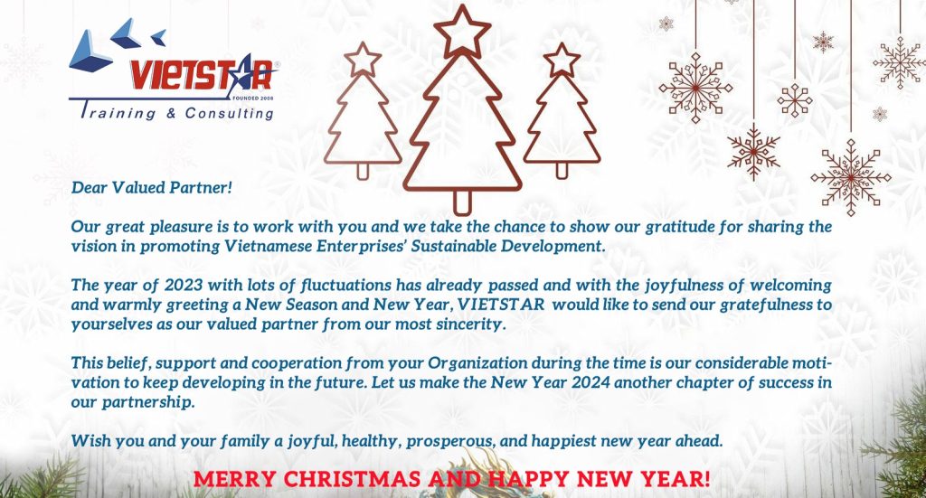 Năm 2023 với nhiều thách thức đã trôi qua, trong niềm hân hoan chào đón một Mùa Xuân Mới. VIETSTAR xin gửi lời tri ân chân thành nhất đến Quý vị – Đối tác tin cậy của chúng tôi.