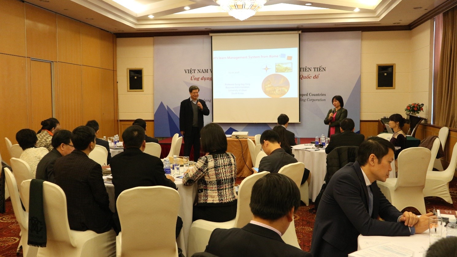 Tại Hội thảo, GS Sung Hag Yong – Đại học Ulsan, Hàn Quốc; thành viên Hội đồng Quản trị của tập đoàn dầu khí Quốc gia Hàn Quốc; Nguyên Phó Tổng giám đốc Tập đoàn năng lượng SK – Hàn Quốc” chia sẻ chuyên đề về “Yếu tố thành công then chốt (KFS) của Đế chế La: Phương thức tồn tại và phát triển trong bối cảnh toàn cầu hóa và kỷ nguyên CMCN 4.0” và “Mô hình Quản trị hệ thống của Tập đoàn SK: Ứng dụng mô hình quản trị hệ thống của Hàn Quốc để trở thành doanh nghiệp đẫn đầu”. Việc áp dụng Quản trị kinh doanh theo hệ thống sẽ mang đến nhiều lợi ích cho Doanh nghiệp: (1) Tài năng thống nhất mang lại sức mạnh thống nhất, (2) Nâng cao hiệu quả kinh doanh, tối đa hóa lợi nhuận, (3) Sử dụng tối đa nguồn nhân lực và (4) Nâng cấp trình độ quản trị kinh doanh thông qua việc thực hiện các phương pháp quản trị đã được các doanh nghiệp đẳng cấp thế giới sử dụng.